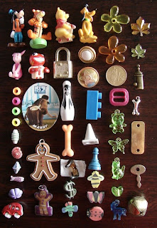 Pririnkite 40-50 smulkių daikčiukų. Tai galėtų būti bet kas: sagutės, lošimo kauliukai, Kinderio žaisliukai, karoliukai, puzle detalės, plastmasinės raidelės ar skaičiukai ir t.t. Kuo smulkesnis daikčiukas, tuo sunkiau bus jį rasti.